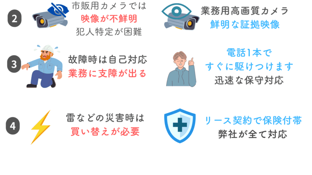 ネットで購入した場合、録画が止まっていたり、ネットワークが切断されたりしても、誰も教えてくれません。事件が起きてから「録画されていなかった」と気づくのでは、防犯カメラとしての役割を果たせません。